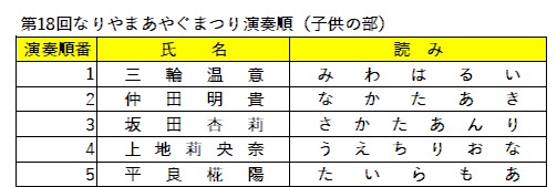 「第18回なりやまあやぐまつり」<子供の部> 5名の演奏順番です。