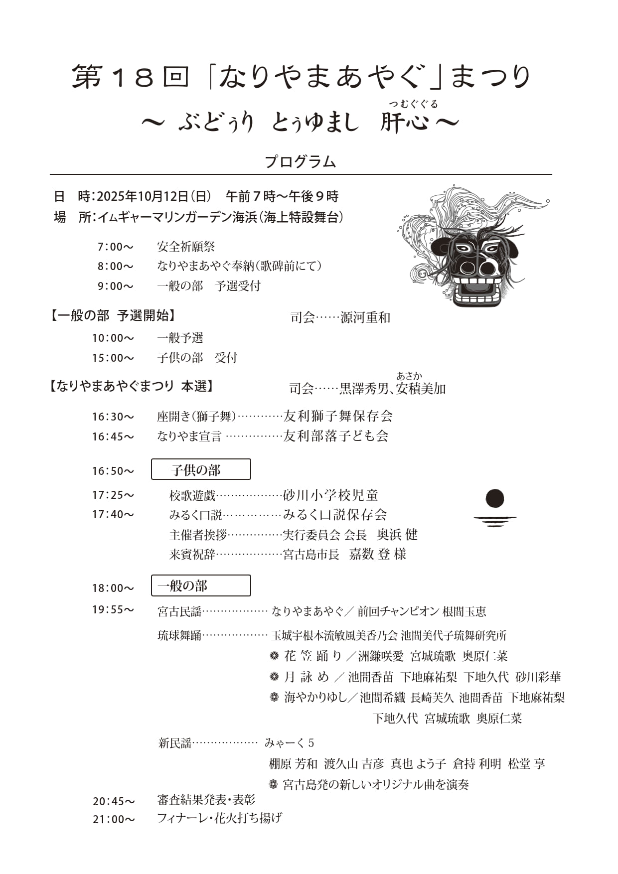 「第18回なりやまあやぐまつり」一般の部 出場者演奏順